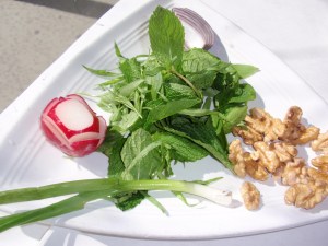 Suz and I had eaten most of this simple salad before I thought to take the photo. The the walnuts had been presoaked in water to remove that slight walnut bitterness. And the pile of herbs didn’t need dressing. FRESH! So fresh and so GREEN.