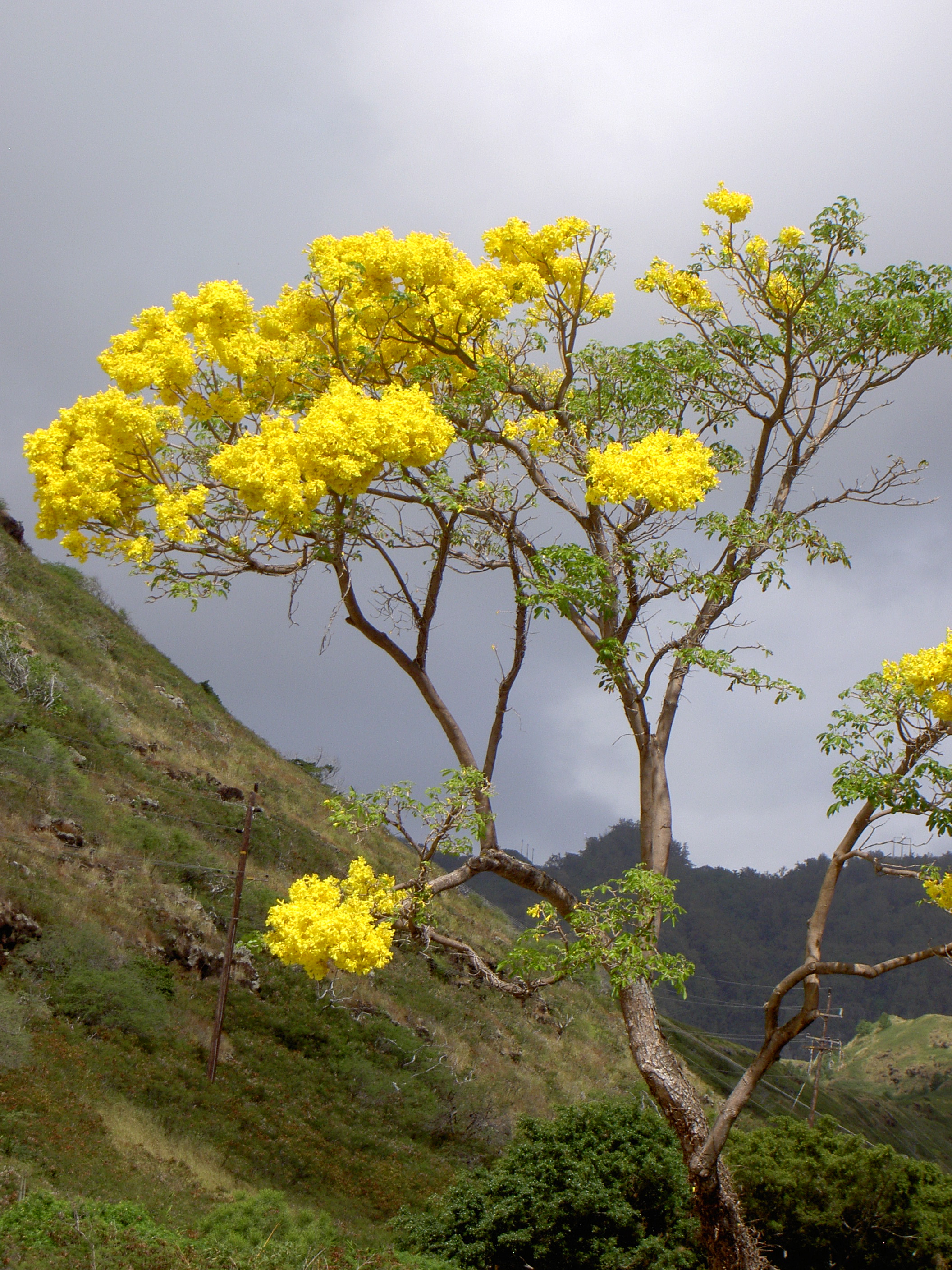 It was a wet, grey and rainy day yesterday. So when I saw that one of the Gold Trees on Hawaii Kai Drive was starting to bloom — I pulled into the JAIMS parking lot and came to a full stop to take this photo.