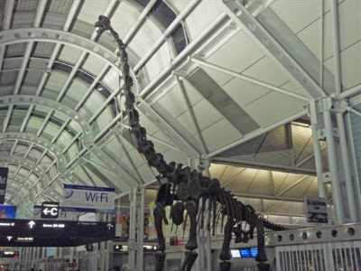 On the walk to our terminal Kit put his bag down right next to the dinosaur’s rear foot — and as I commented on how I’d never stood underneath it before — Kit looked up and confessed he hadn’t seen it.