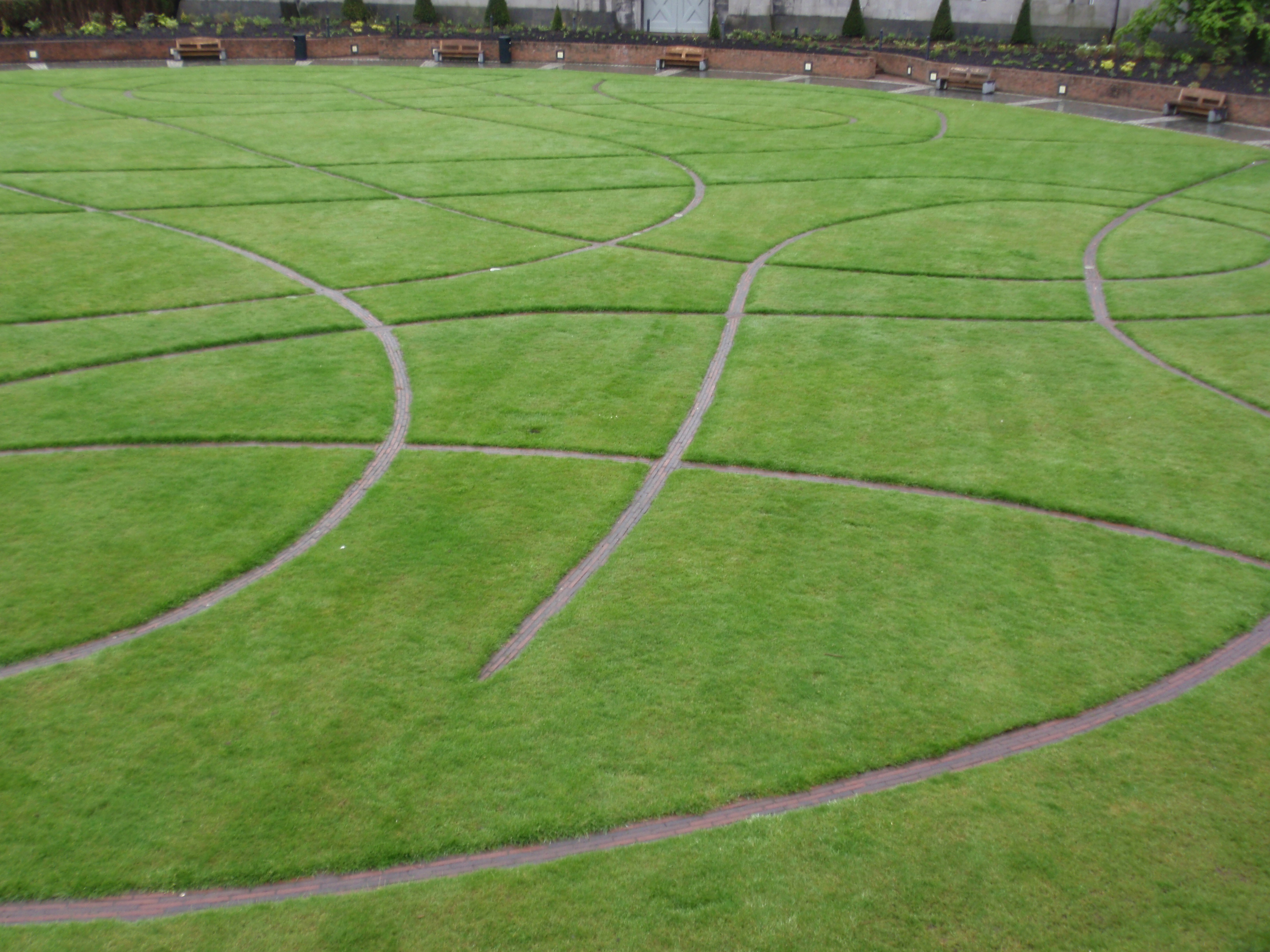 This afternoon, I stood inside the Dublin Castle looking at this lovely green lawn with the brickwork pattern laid out in it. I could see that some “paths” came to a deadend, but I wasn’t quite high enough to see if there was a way to successfully complete the circuit.