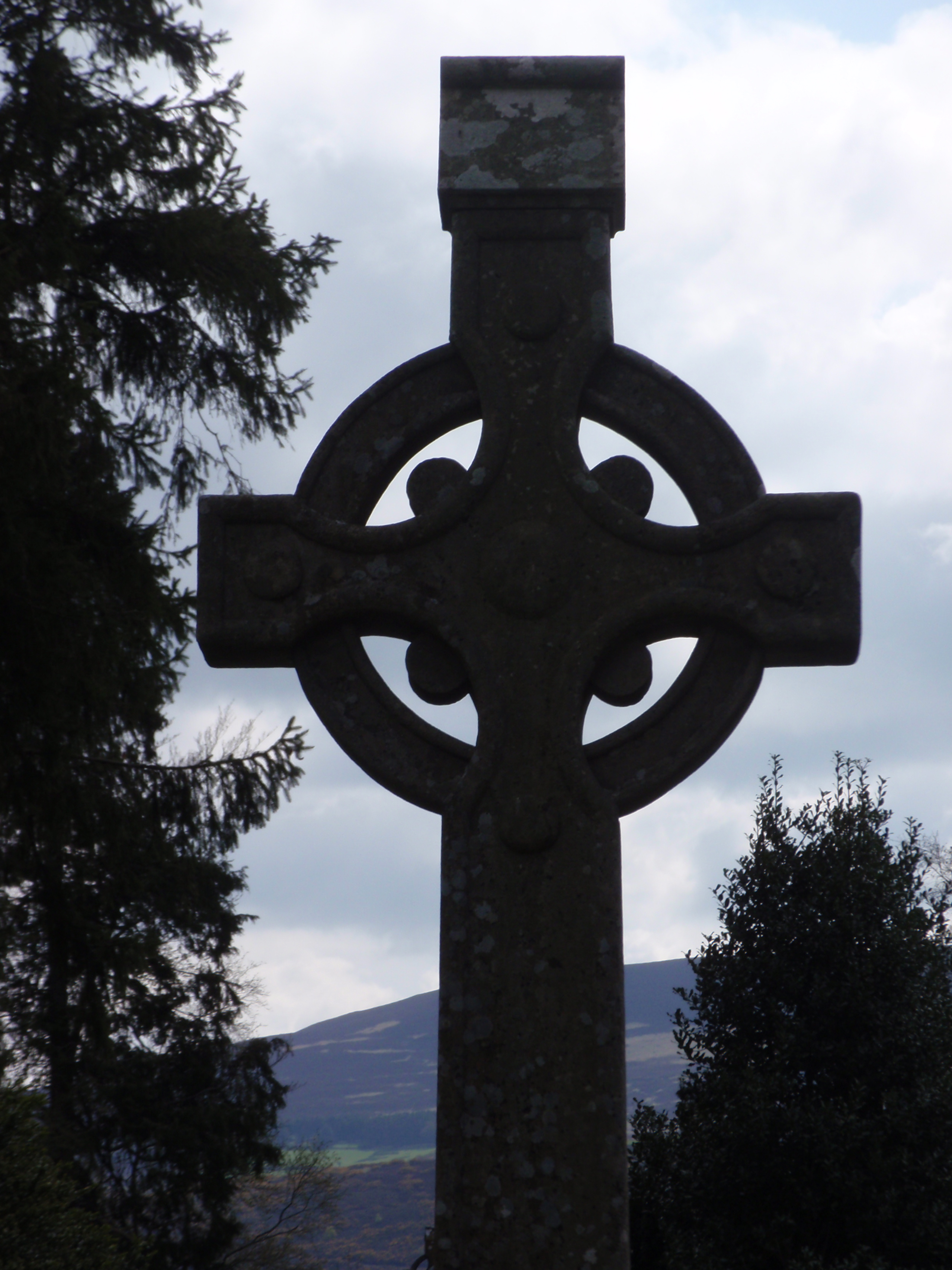silhouette of a celtic cross in the monastery grounds at Glendalough, Ireland