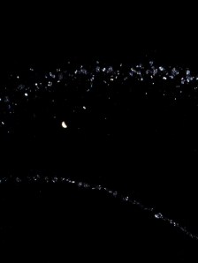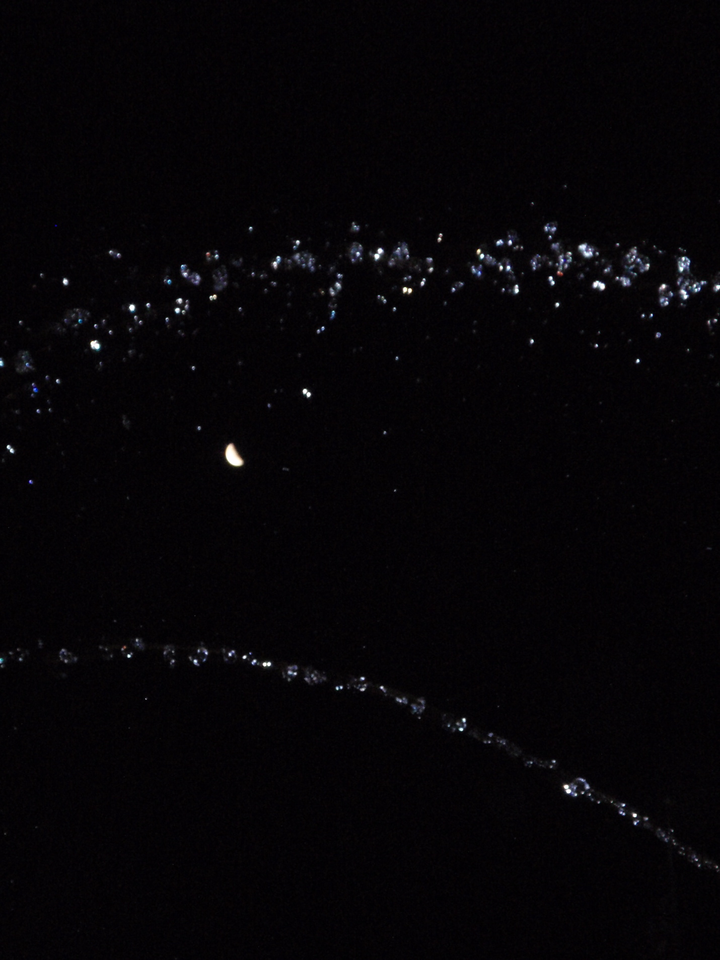 This photo was taken EARLY yesterday morning. I was waiting for my airport shuttle at 4:15 a.m. and looking up at the moon. The Portofino Hotel has a lovely fountain in front and the plumes of water from the fountain caught enough artificial light to look like stars.