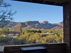 Isn’t this a beautiful view! Sandy and Dave’s home faces these lovely mountains — but the patio was in the back of the house. Dave had double glass doors put in the front and then had a brick patio put in all along the front of the house — facing the mountains. And this view is through the covered grilling area he had built.  I really like it.