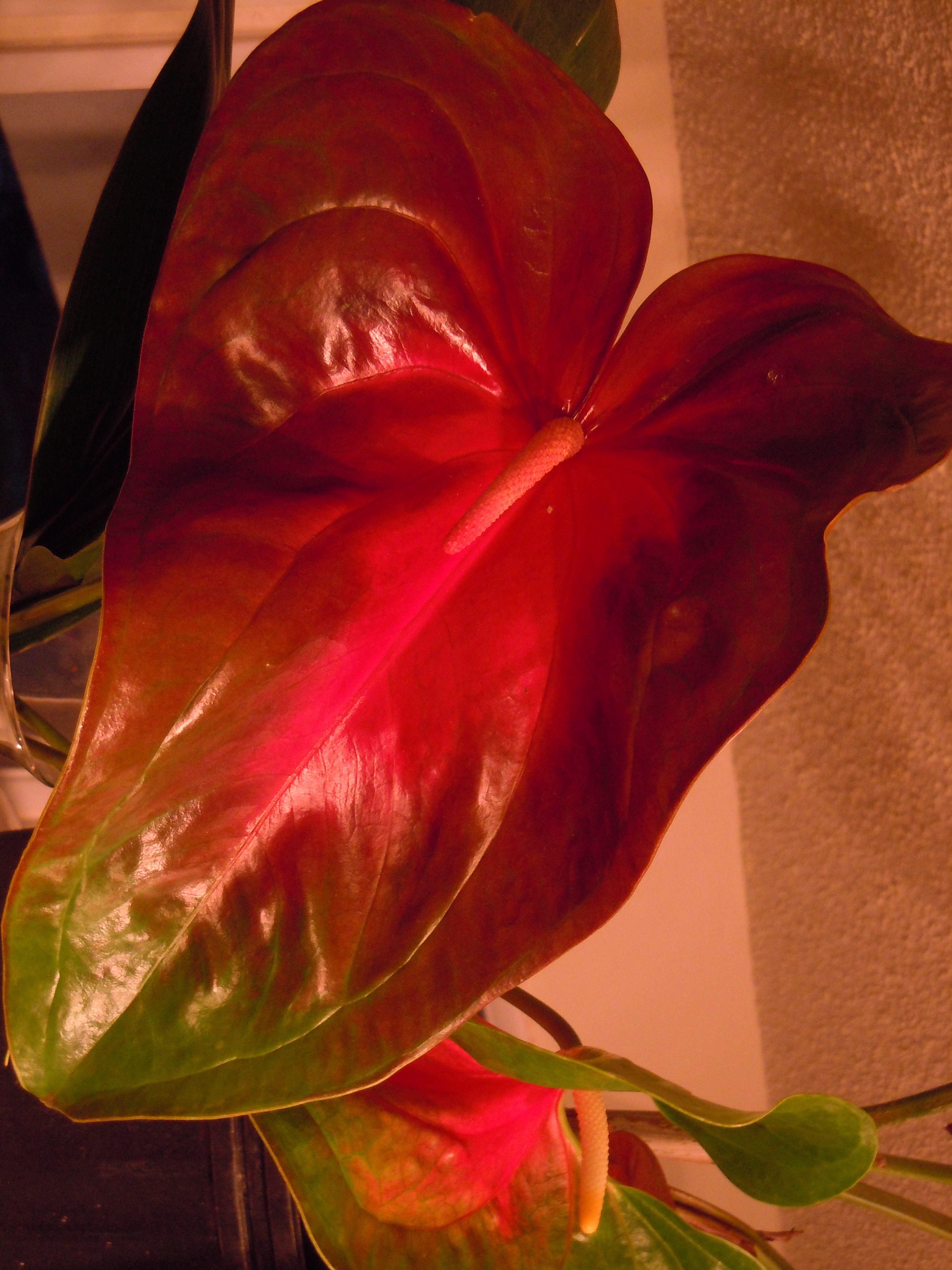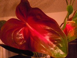 Saturday evening I scurried around Getting Ready for the Sabbath Day. Stuff got put away, if not done. So when I got up in the morning my environment was restful. Work was BEHIND my desk — not in front of me. Funny how easy it is to forget little tricks like that. While not smelling the roses, literally — I did admire this giant obake. I learned that anthurium are related to taro, philodendron and monstera. I love flowers and I am learning to make sure I have them in our home.