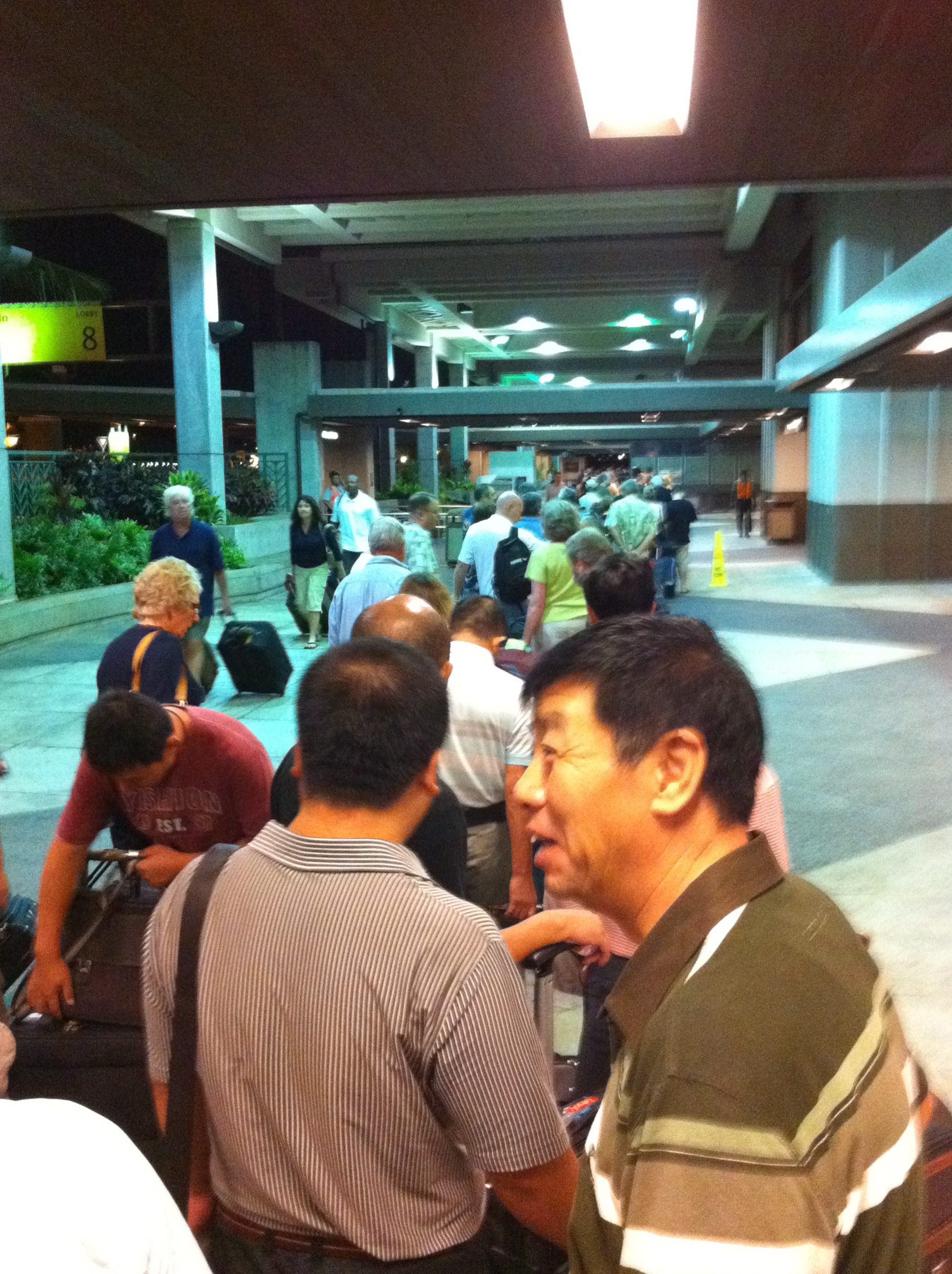 We compromised on leaving at 4:45 and I got to the airport at 5:09 — only to see a line that went on and on and on — just to go through the agricultural inspection. YIKES! I almost didn’t believe it. I wanted to go to the front of the line to check. But the line was growing longer by the second, so I hurried down to the end.