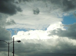 until I was driving Mark to a friends at noon that I noticed how full of clouds the sky had become.Later that afternoon, when I was taking Ian off to buy him sunglasses that fit, the sky became covered by a mass of grey — not even distinct enough to be called clouds. Ian and I chatted happily and went on to Basha’s for his preferred cheese (Boars Head Red Wax white sharp cheddar cheese) and hot dogs, etc. Then shortly after we got home it did actually rain! At first it was so soft and gentle I could barely hear it. But I sat outside to smell it and listen as it became a steady pitter pat.