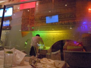 Such a layering of Cultures and Times, God. I think I was sitting next to an engraving on a glass pane of a Persian King and cuneiform writing. The oven looked like it might well have been used to cook for that king. But, in this photo are images of TVs and also reflections of the TVs placed in every corner of the restaurant– AND in the women’s bathroom — of all things.