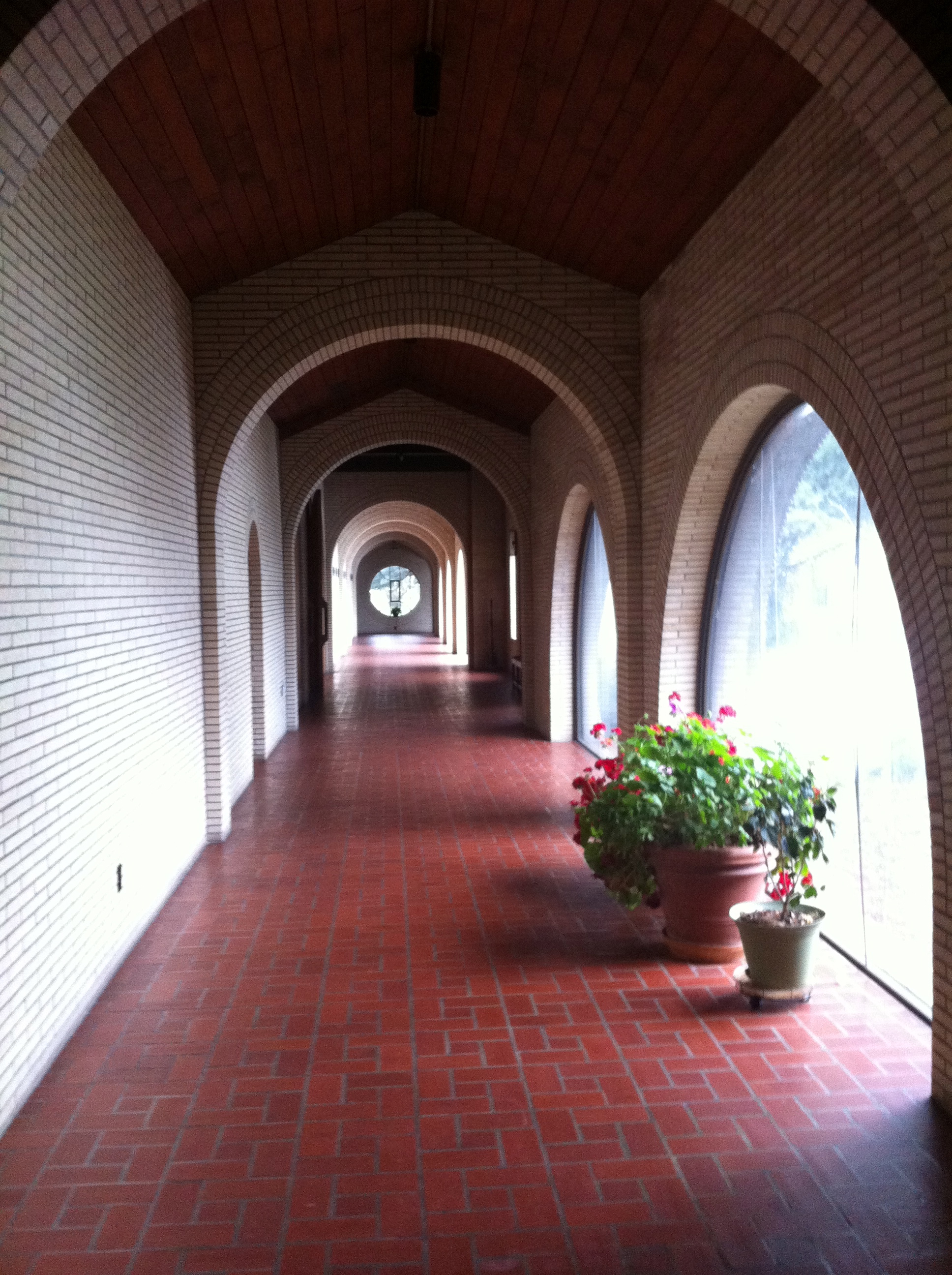 Looking at the simplicity of this hallway — leading from the gift shop to the chapel — I am mindful of the amazing clutter of my office and of my downstairs guest room, now my unpacking area.