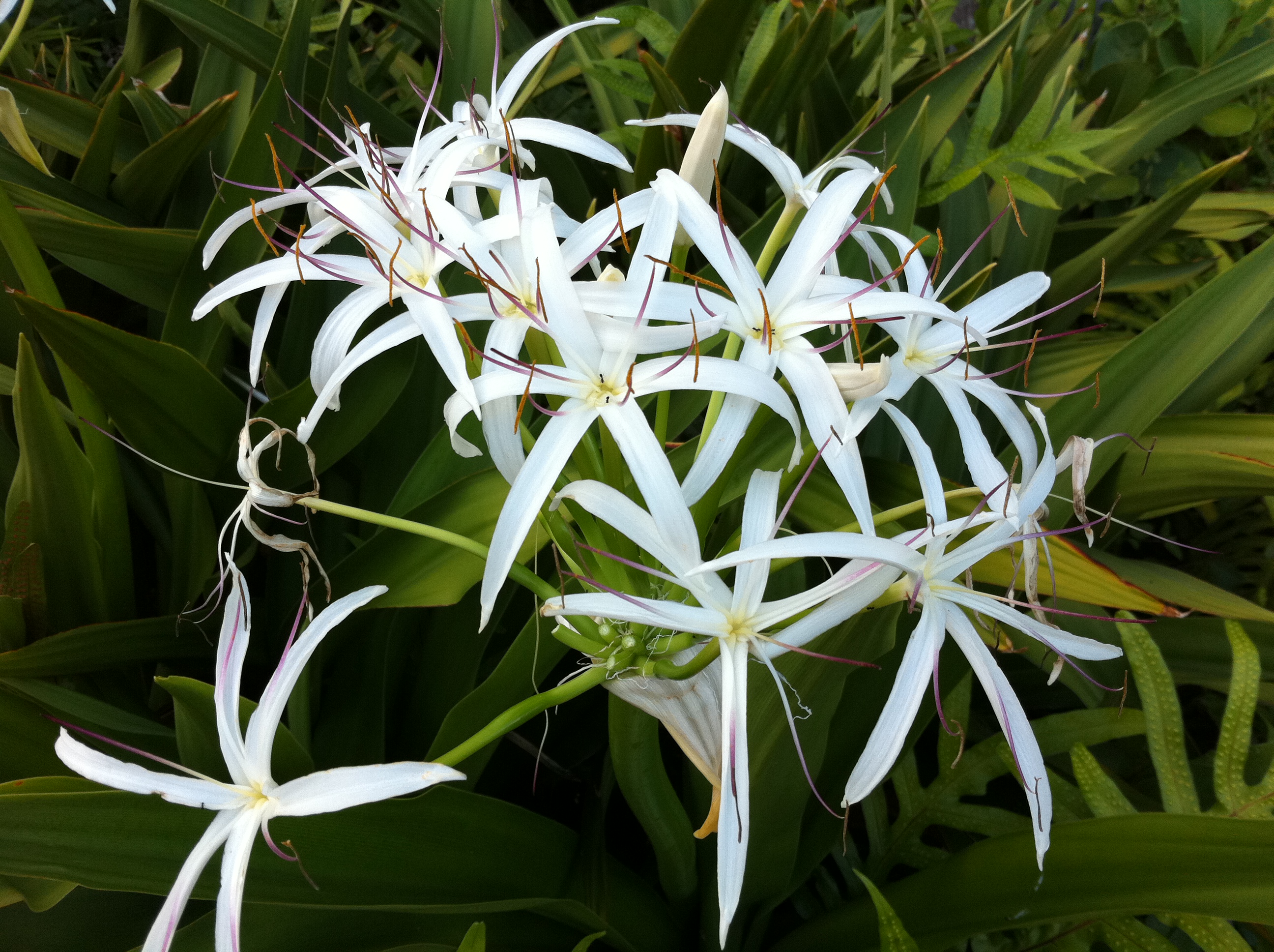 Several days ago I was taking photos of a spider lily blossom. The bright blue marina was the background and it just didn’t work. But when I saw the delicate white petals against the dark green foliage — Aaah!