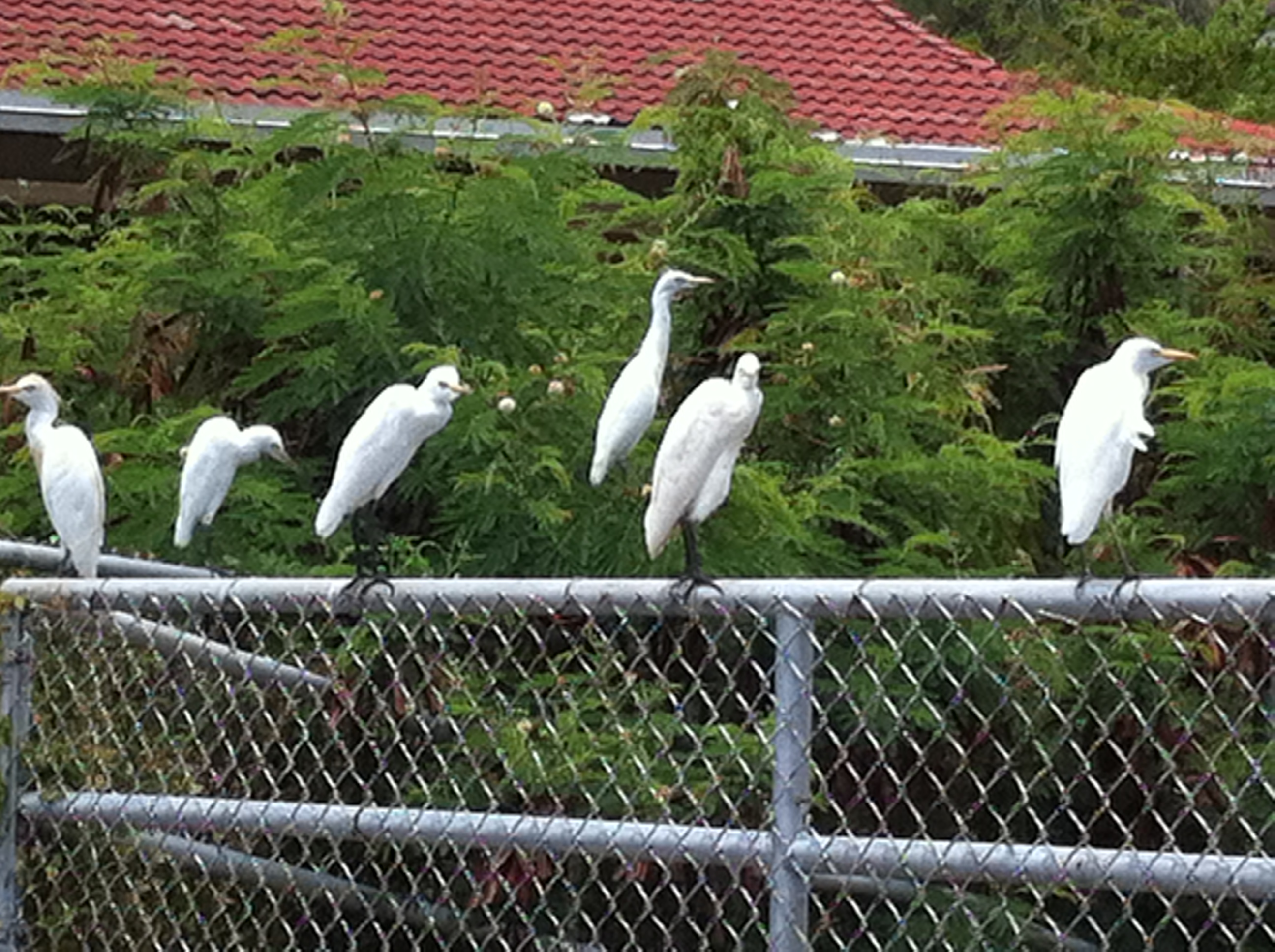 I still think they are beautiful, God. But, they are multiplying! And I am beginning to suspect there are too many egrets. I can usually count 20 to 30 in the park across the way. I took this photo as I was poised to come out of our driveway — because there were nine egrets together on the fence across the street. Usually they are spread out — each in his or her own territory.