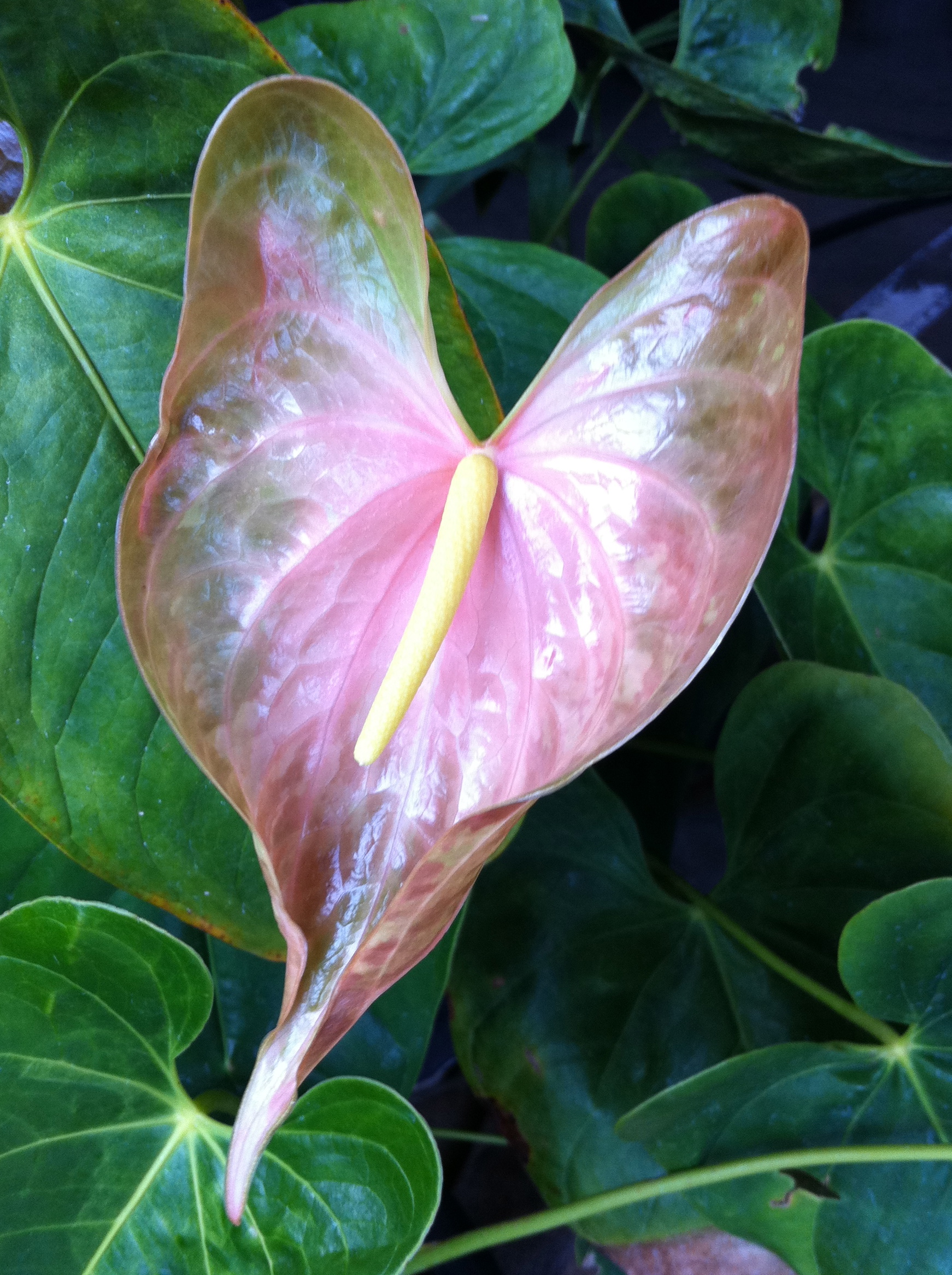 This is still a very young anthurium — only a bit over 6 inches now — and last week it was so furled up an small I thought it might be a leaf. Funny how anthurium leaves and flowers start out looking pretty much the same.