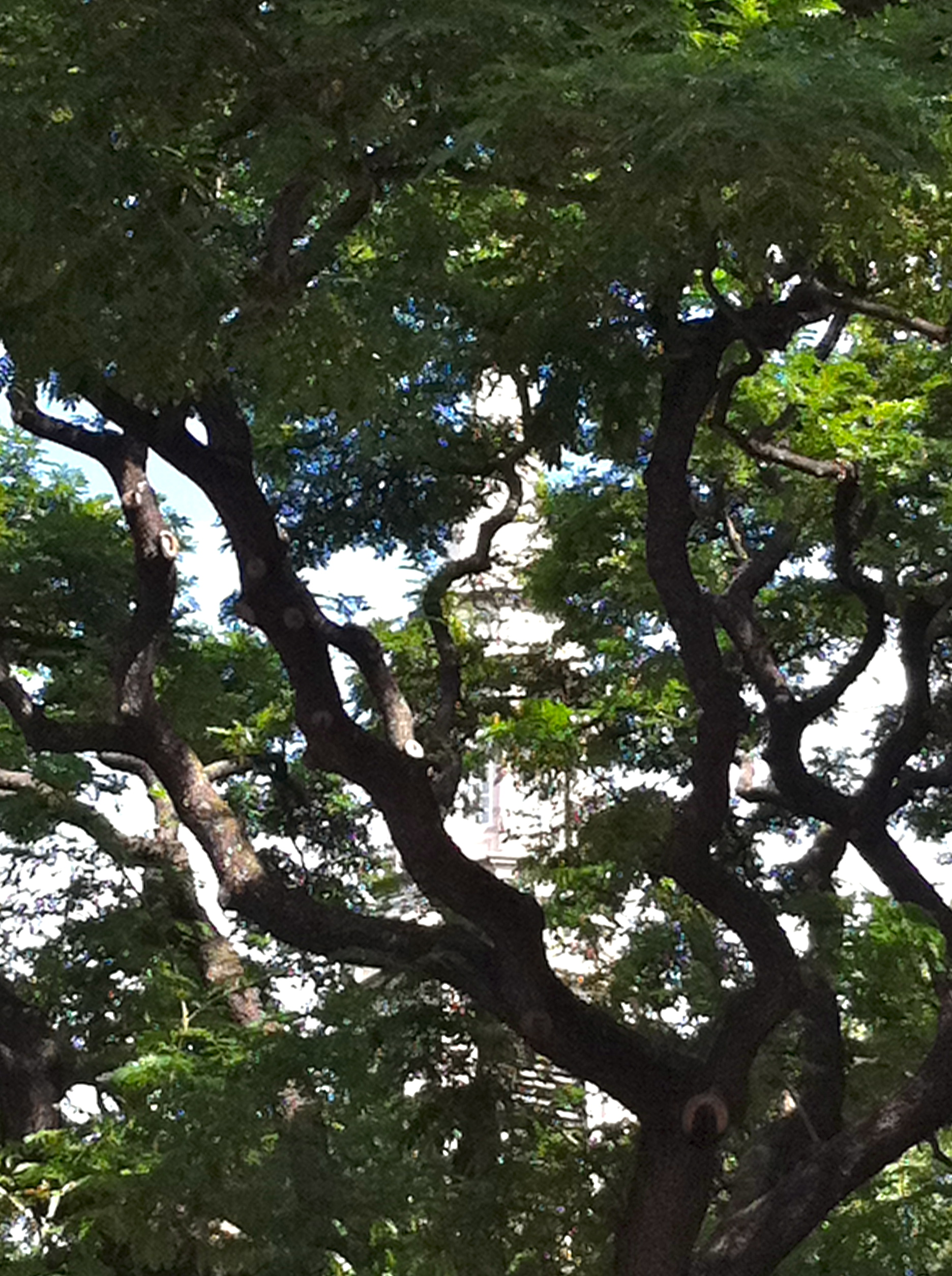 I was at my women’s prayer group at church. And it was just my car keys I’d locked up, not my purse or cell phone. So after calling Kit (not home yet), I called AAA and wandered into the church thrift shop, spent $4, chatted, and then sat down near this tree — to wait. To wait peacefully!