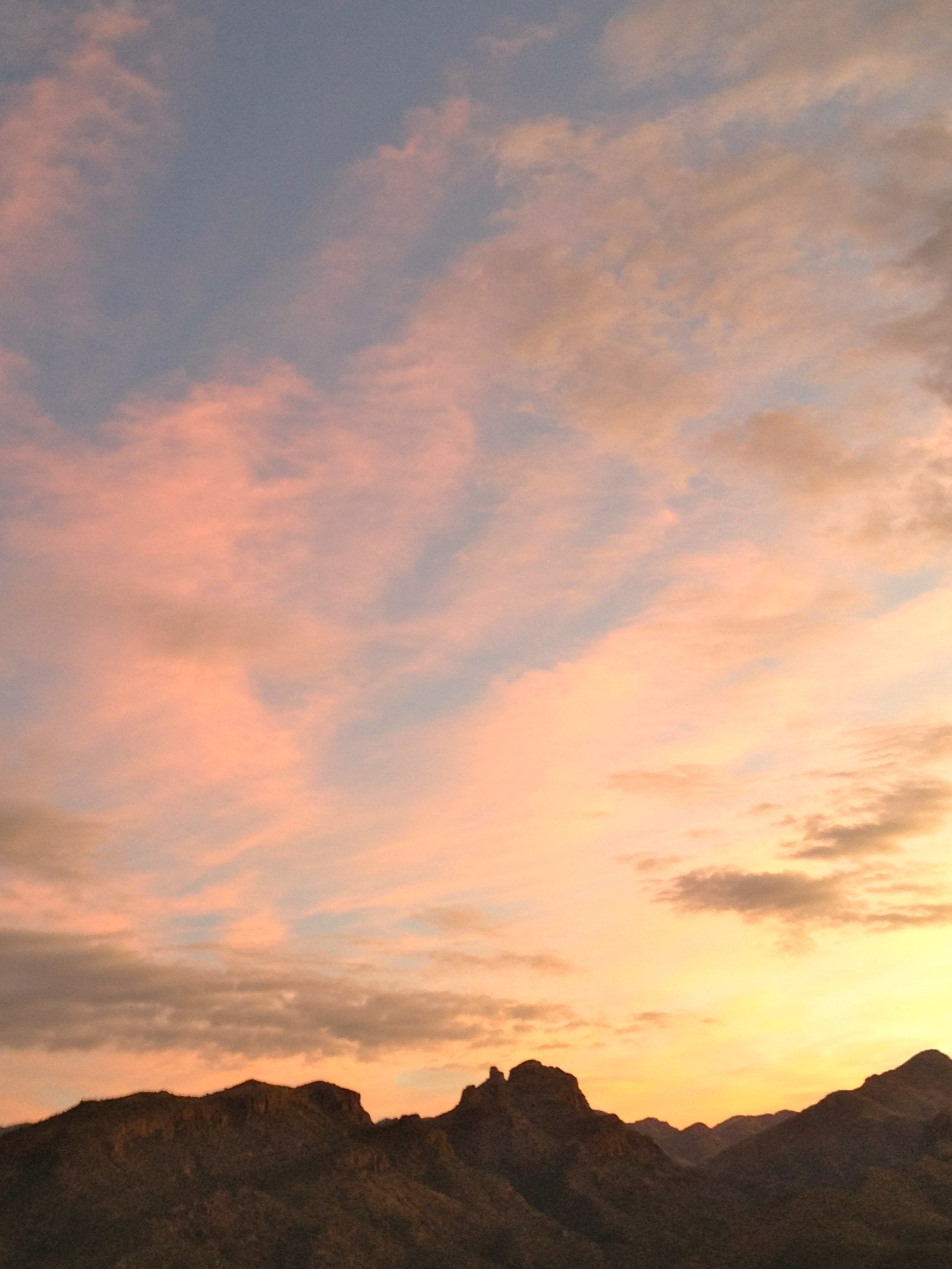 Deciding is hard. But, the other morning it hit me with fresh power that Later is very close to Never. That’s especially true with Dawn, and I realized that morning was the first dawn “with clouds” since I’ve arrived in Tucson. It was the thought of pink clouds that got me up. And once up and moving, it was easier to keep moving. So I went out jogging — this time for a full two miles. Newton was right. Bodies in motion tend to stay in motion.