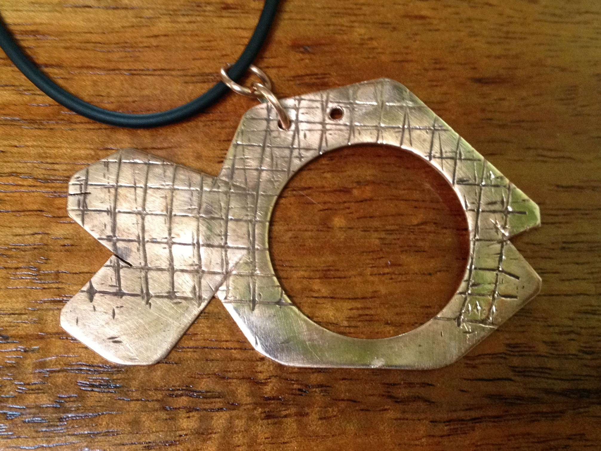 This fish pendant was “found” hiding inside an old piece of scrap copper in our jewelry class’s scrap box. I’d missed three classes so after the demonstration I didn’t have anything to work on.