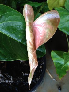 Anthuriums are slow to grow. They start out tightly furled. In fact, when they begin I can’t really tell if the shoot will turn out to be a leaf or a flower. It takes time for it to fully unfurl. Even when shoots are fully extended they continue to stretch out and grow.