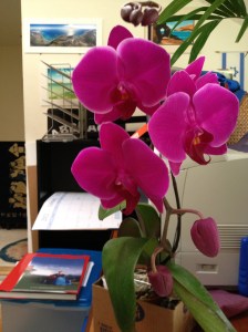 Actually, it is BEING home that is glorious. The home could use a little help. This gorgeous orchid is still in the box it came in because I have been out all day.