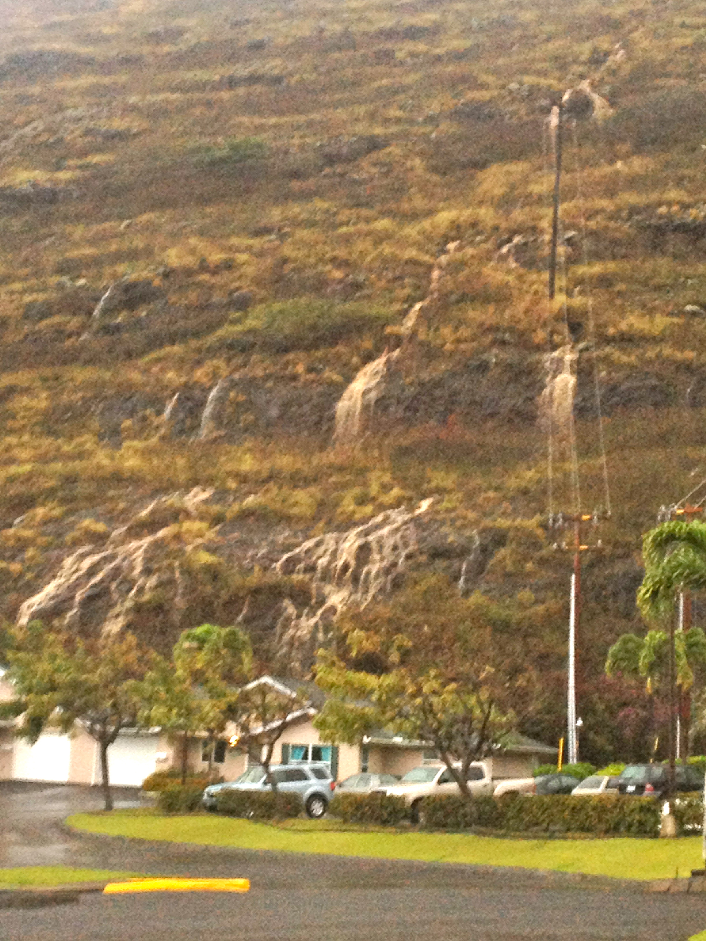 Here on Oahu, my husband Kit reported that hail came down on his car as he was driving to Aina Haina for an eye check-up. And I saw boys boogie boarding all the way down the Hahaione Valley drainage canal near our home.