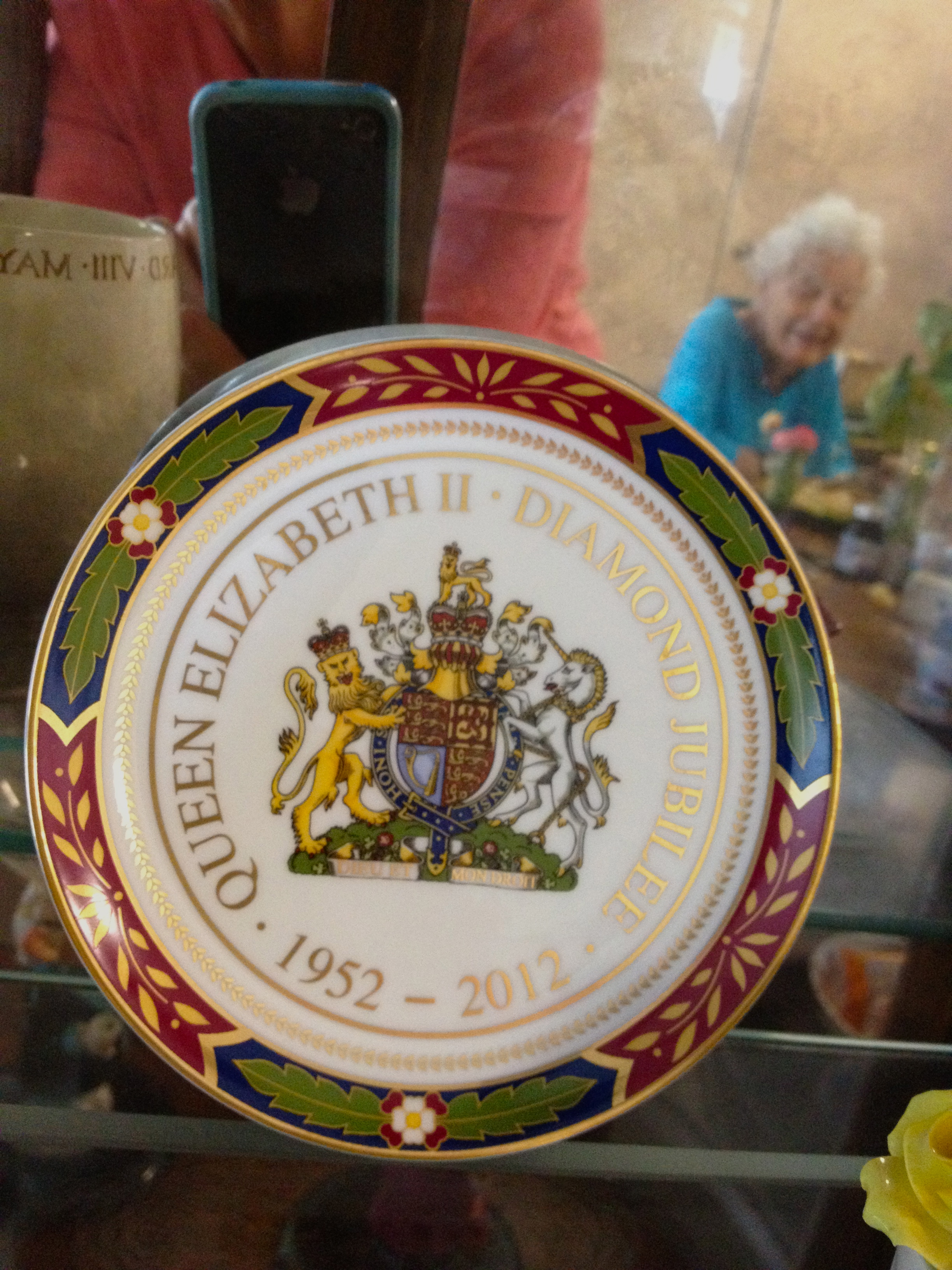 And now a more upbeat word: I gave my mom this Diamond Jubilee plate commemorating Queen Elizabeth’s 60 years on the throne. My mom admired it and then said, “Oh I remember her when she was just a little girl!”