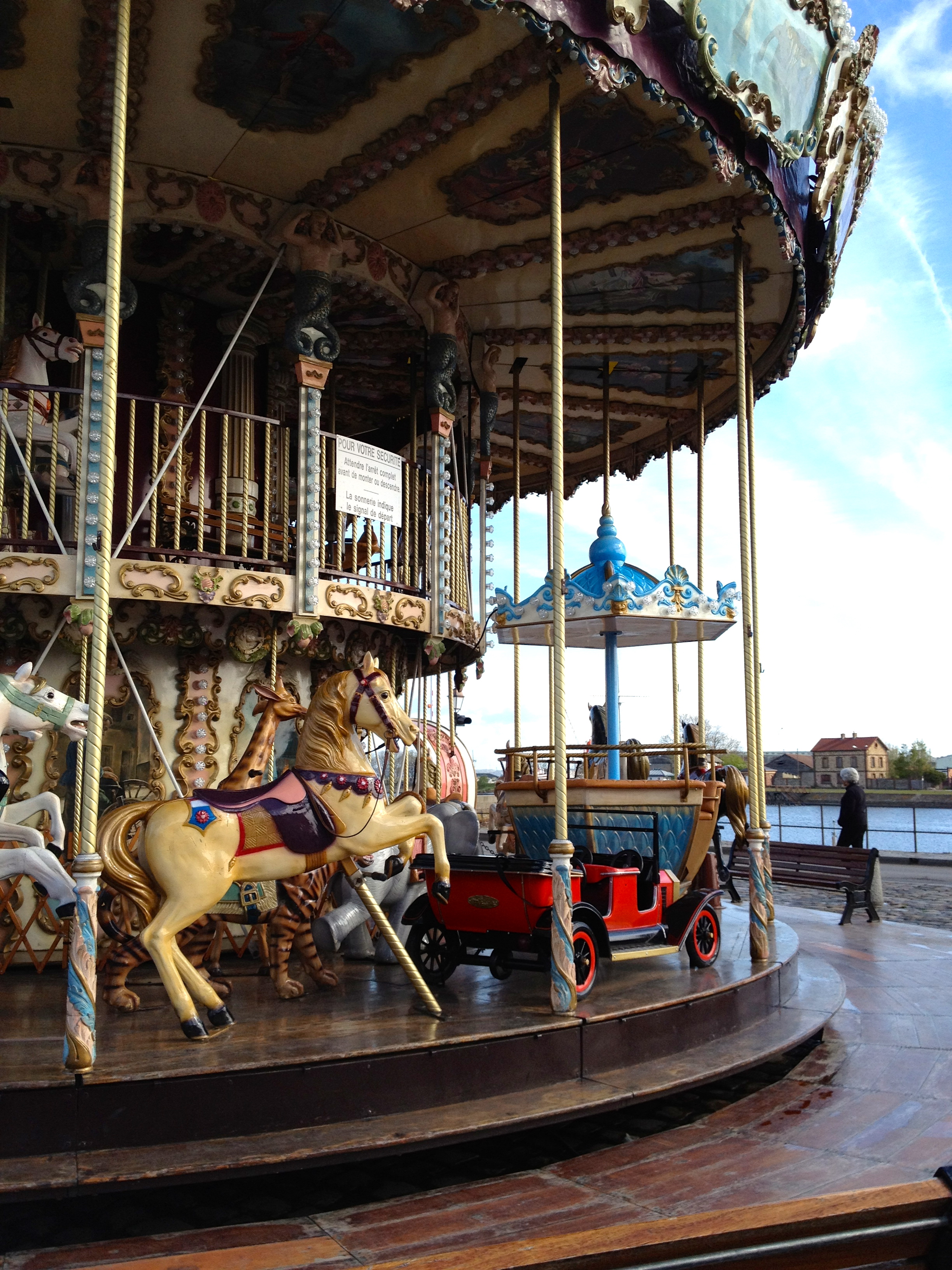 I have always loved carousels. I can still remember the steam calliope in the hills of Berkeley with its crashing circus music and majestic animals circling round and round. Aah! The gentle rides of days gone by. No roller coasters for me, God!