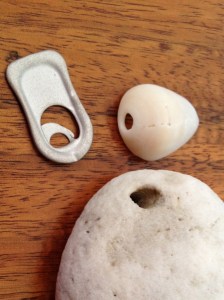 Then I pulled out the three objects I had picked up on the beach. A beverage pull tab, a shell fragment and an old smooth piece of coral. What do they all share? A HOLE!