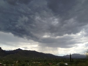 Kit and I are here in Tucson — here with daughter Sandy’s family — here in monsoon season. This particular cloud moved over us with just a light rain. Ah, but at dinner we dined outside on the covered lanai with lightening and rolling thunder.