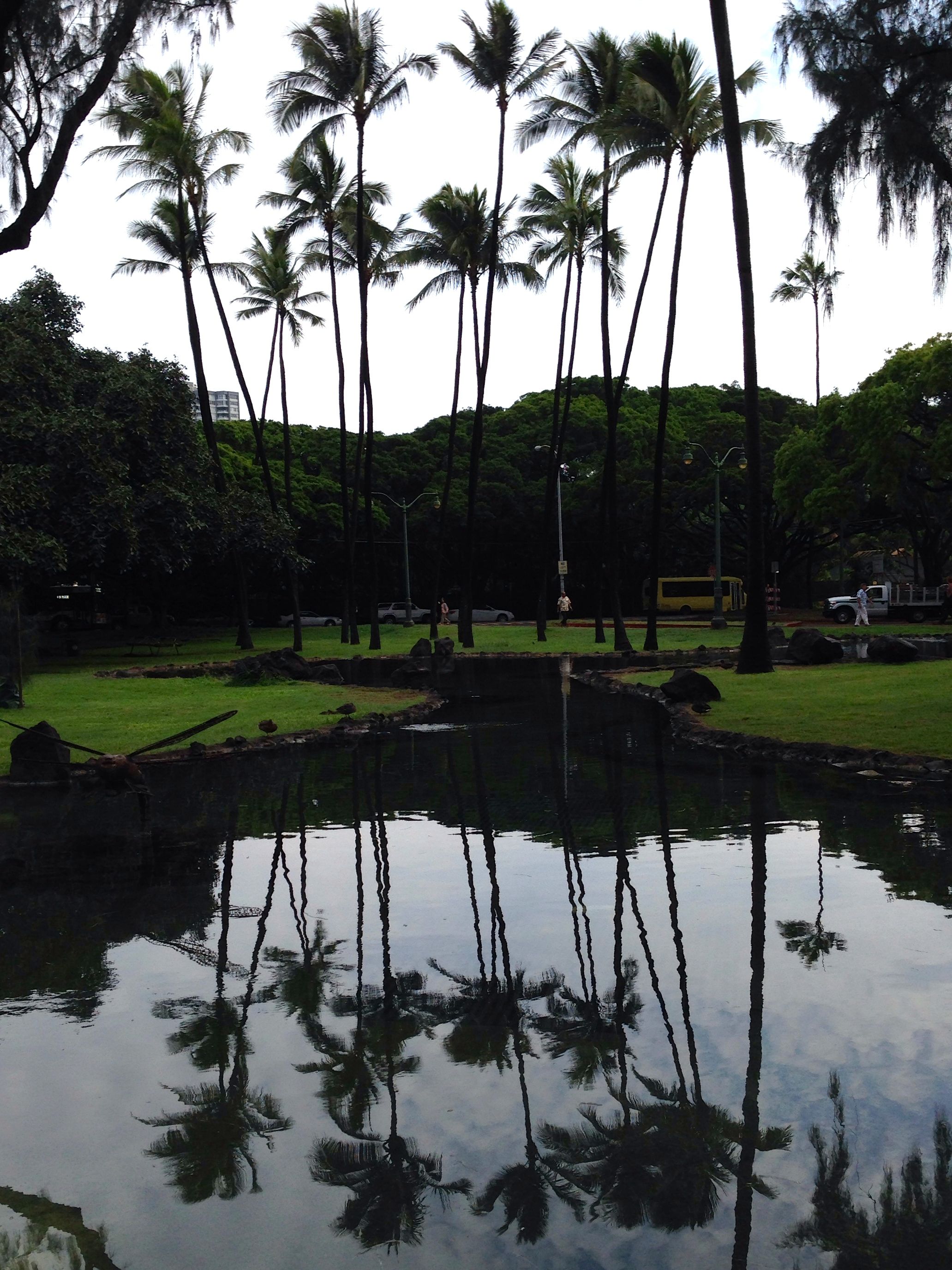 I took this photo on Friday . . . a day with winds bringing volcanic “Vog” from the Big Island. So the sky was grey not blue. Rain clouds also contributed. I love my Hawaiian World — grey skies or blue.