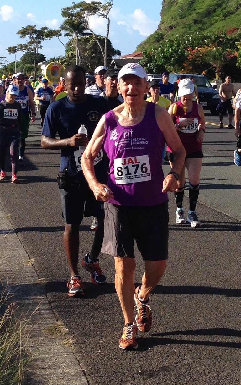 My wonderful husband Kit gave me a HUGE Love Gift this morning when he agreed not to finish the Honolulu Marathon. I met him at mile 16 — right by our home — and gently asked if he wouldn’t come home with me. His pace was below forecast and he seemed a bit wobbly. True, God, to make my case, I DID say that his Women folk (our two daughters and I) were STRESSED. (The daughters, both on the Mainland, were following his progress online.)