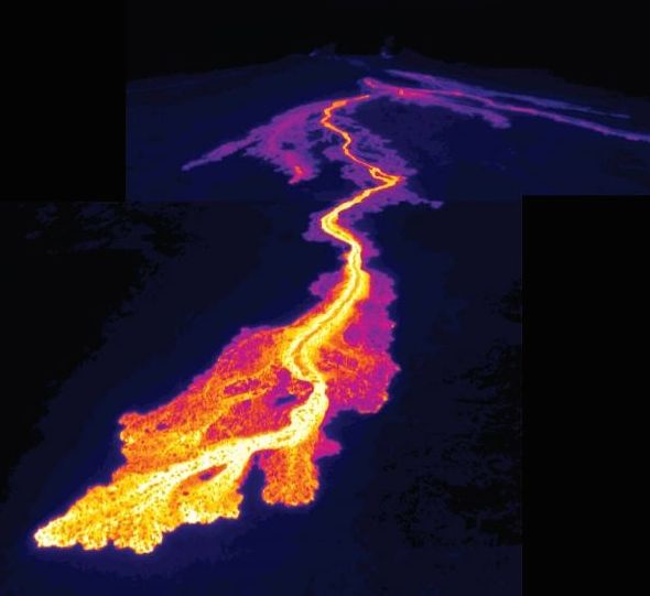 I saw this photo in yesterday’s newspaper. And I longed to see the photo “lit up” on the web. It’s a thermal image — so Vivid and so Hot! I love it. We saw something very much like it years ago. Bright lava flowing down the mountainside at night.