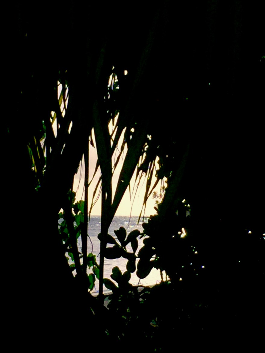 I’m tired. After a great night’s sleep on Thanksgiving I was up and down most of last night. And I am feeling a bit bleak. So this photo fits my mood perfectly. The view is of the beautiful blue ocean . . . but it is seen through the shadows of a Lauhala tree. Sigh. This tree was planted as a memorial for a friend’s son. Somehow, God, my normal UP mood is down.