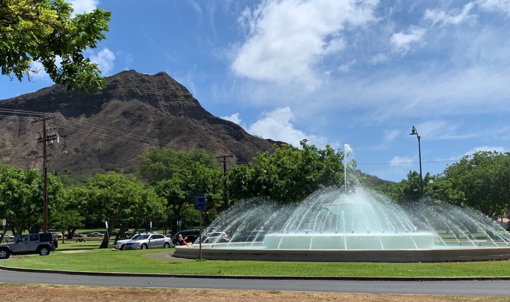 Now that I am back to swimming frequently, I drive by this fountain several times a week. And each time I get a visceral reaction! The LIGHT. The WATER. And Diamondhead in the background! I long to take a photo so I can SHARE the beauty. But, I’m driving. Sigh. But the other day there was no traffic behind me. . . and so I slowed down . . . and snapped three quick shots! Vola!