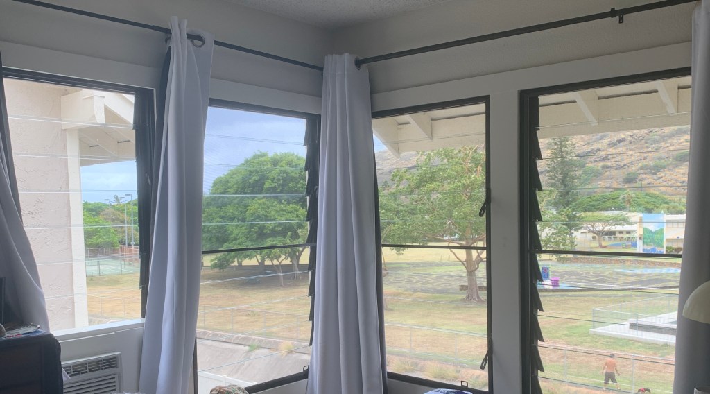 Still, being away, meant that when I came home, I was able to see our bedroom with new eyes. And, I realized that these windows — overlooking the Hahaione Elementary School and Park — were blocked by a huge, tall maple dresser, a five drawer plastic bin, and containers of things waiting to be released. Perhaps, being really tired helped make me aware of how very much I wanted to look out at Nature. Nature is healing — harmonizing — a delight to the eyes and soul.